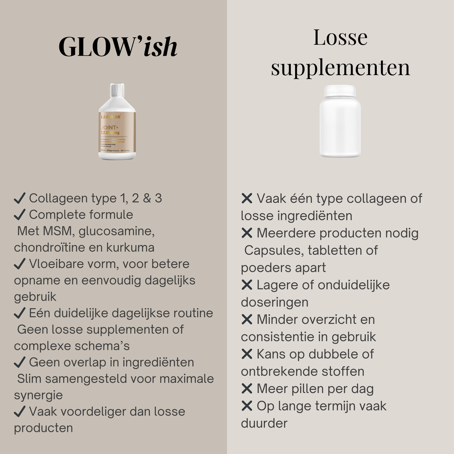 GLOW'ish onderscheidt zich door de hoge dosering van 13.000 mg nano-gehydrolyseerd vloeibaar marine collageen (<1500 Dalton), wat zorgt voor een snellere en betere opname in het lichaam (96%). Daarnaast bevat het een krachtige mix van actieve ingrediënten zoals hyaluronzuur, retinol, vitamine C, silica, biotine en selenium, die samen bijdragen aan een stralende huid, sterk haar en gezonde nagels.