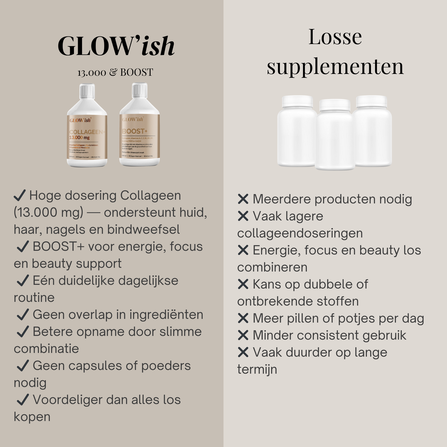 De combinatie van GLOW’ish Collageen 13.000 mg en BOOST+ is ontworpen voor wie niet wil kiezen tussen beauty, energie en focus.